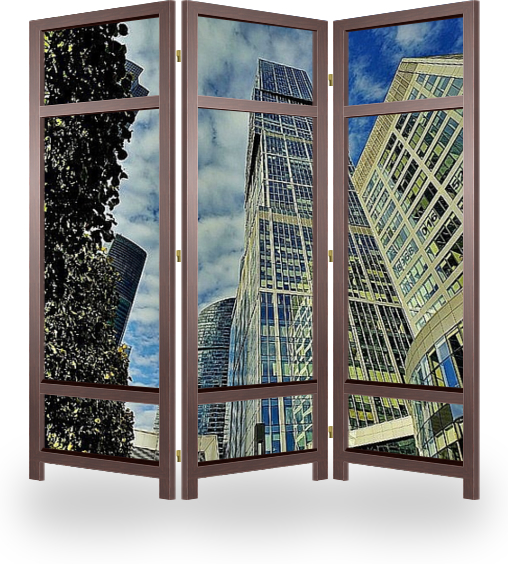 Описание ширмы чудесные облака и октябрьское небо отлично контрастирует с футуристическим формами небоскребов Москва Сити необычный ракурс создает отличное романтическое настроение