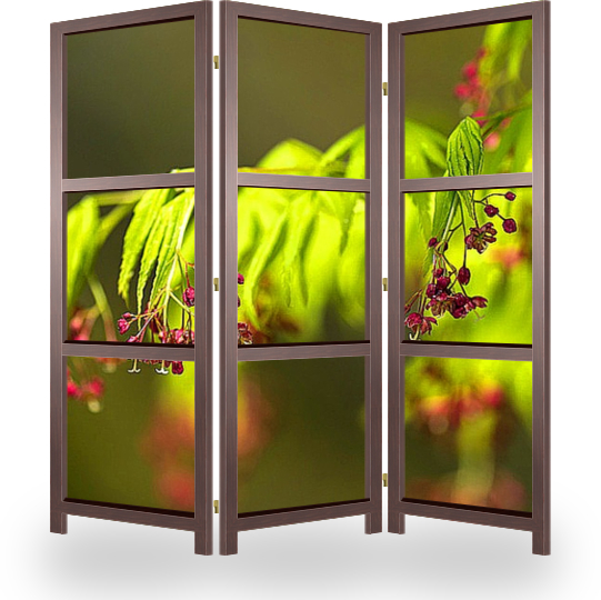Описание ширмы Весной зацветают не только первые цветы, но и на деревьях распускается первая нежная листва, появляются цветы. Очень красиво цветёт клён дланевидный. Мелкие красные цветы на фоне нежной зелени смотрятся очень красиво!