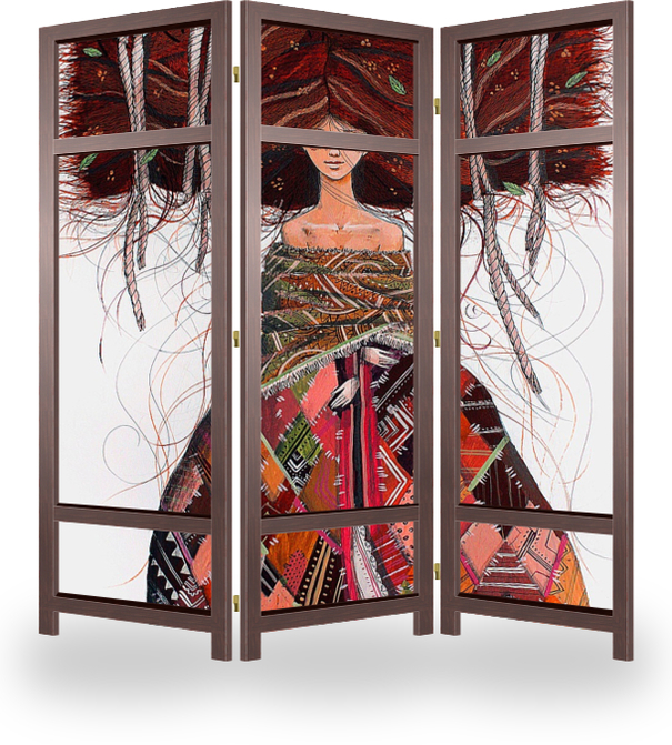 Описание ширмы Графика "Рябинка" выполнена в смешанной технике, отражает новый взгляд на русскую народную тематику. В художественном творчестве рябина наряду с березой является поэтическим символом России. Священное дерево древних славян. Изображена в образе девушк