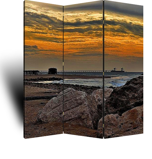 Описание ширмы Осенний вечер на морском побережье, с красивым живописным небом и огромными валунами на переднем плане, располагающий к глубоким раздумьям о любви, о смысле жизни....