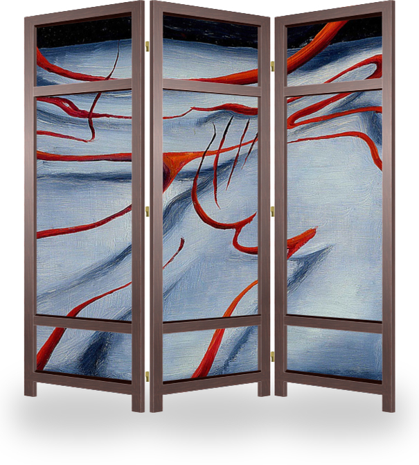 Описание ширмы Абстрактная картина в стиле сюрреализм. Дополнительный объем красным дорожкам придают тени на сером фоне. Название картины "Опасность" придумали друзья художника.