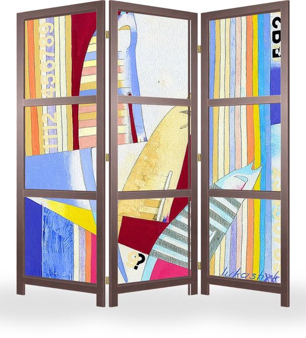 Описание ширмы Композиция составлена из трёх котов в соединении с ритмом линий, в мелодии несвойственной мне гамме цветов, с добавлением минимальных цифра-шрифтовых эффектов.