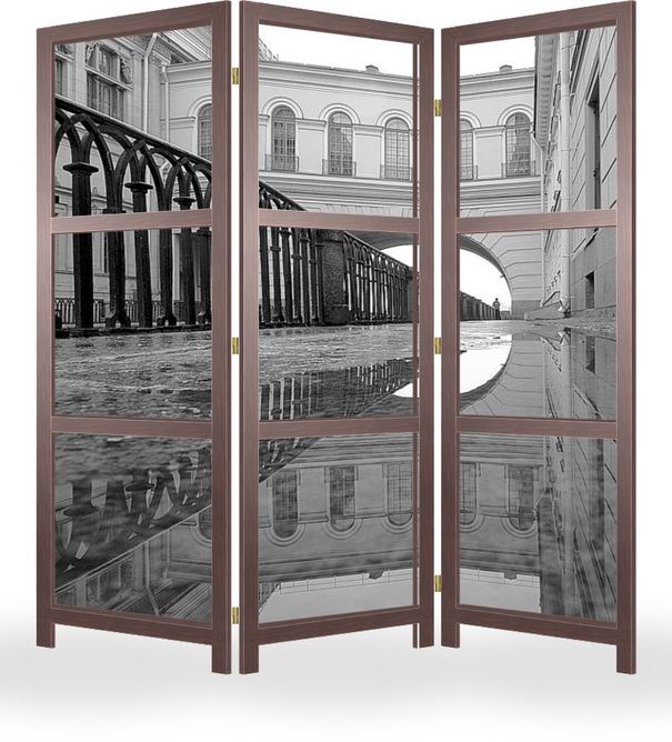 Описание ширмы Низкая точка съемки, дымка, отражение в луже, одинокая фигура художника, мост, Зимняя канавка, набережная, чугунная ограда, сырость, вид на Неву сквозь арку