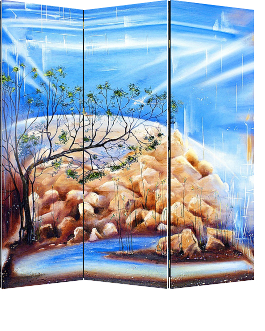 Описание ширмы Обыкновенный сказочный пейзаж, увиденный из окна мастерской и перенесенный на холст.