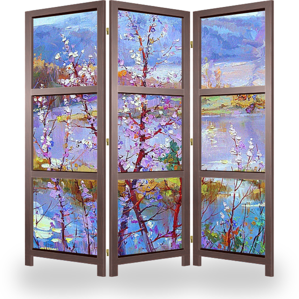 Описание ширмы Вид на Волгу, ветка расцветающего абрикоса, свежий весенний воздух. Всё пробуждается в природе, Всё живёт ожиданием чего-то нового, доброго, красивого