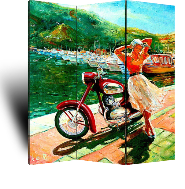 Описание ширмы Картина "Бриз" переносит вас в 60-е годы прошлого века, в СССР. Все граждане Советского Союза мечтали побывать в Крыму, и многие из них отправлялись в путешествие на лучшем мотоцикле тех лет "Ява".