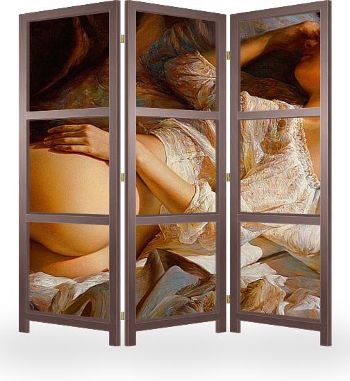 Описание ширмы Оригинал картины "Вечерний свет" написан в 2015 году. Материал холст, масло, размер 40/60 см. На картине изображена молодая девушка в белой сорочке, дремлющая в тёплых лучах солнечного света, на красиво смятой постели. Её тёмные волосы разметались по