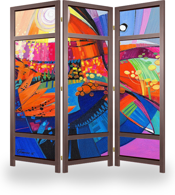 Описание ширмы Абстракция “СОЛНЦЕВОРОТ”, 2015 г. Тема – ЗЕМЛЯ в цветении или… кто - что увидит, воображая свой мир. Яркая и радостная картина. Украсит современный офисный и домашний интерьер. Гости кафе или ресторана также обратят внимание на эту композицию, к