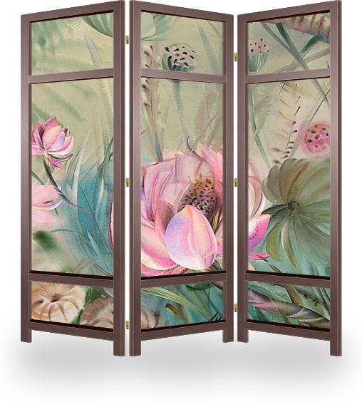 Описание ширмы Туманное утро после дождя и лотосы поскрипывая раскрываются, пруд открывает глаза и оживает... Хотелось передать это свежее чистое ощущение того восхитительного утра.