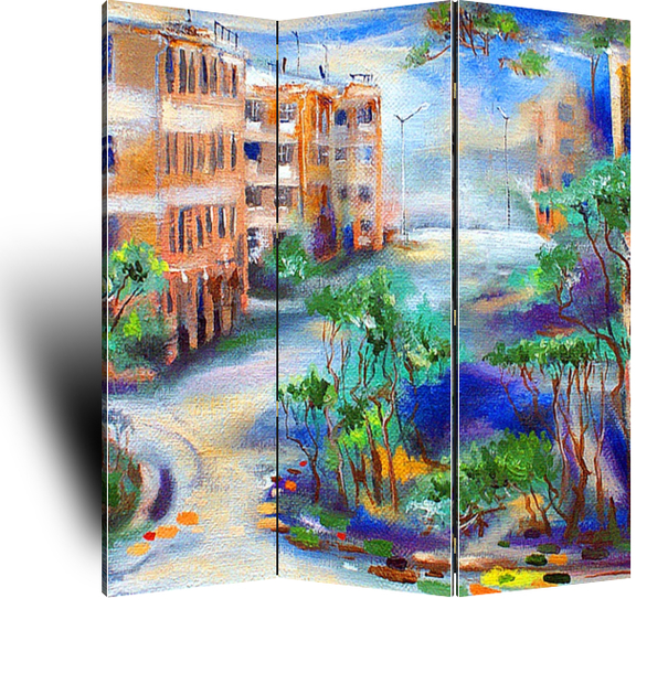 Описание ширмы Картина из серии работ с домами и дворами Академгородка. Эти картины, выполненные немного в другой манере, и привлекают зрителя, туманной расплывчивостью сюжета и цветной, но прохладной перспективой. Эта тема в творчестве автора неслучайна, потому чт