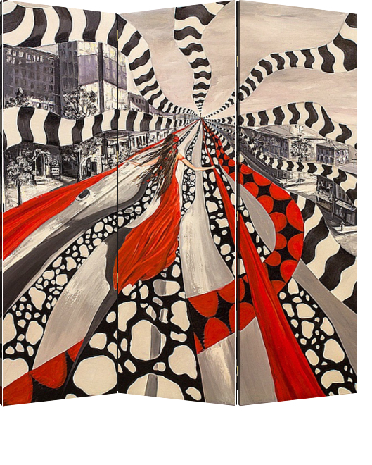 Описание ширмы Абстрактная фантазия на тему человека и его одиночества в обществе. Серый город, пустые улицы, плоское небо и надежда на горизонте.