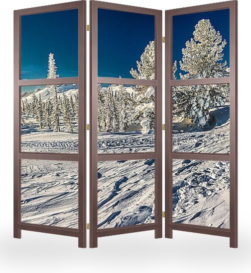 Описание ширмы Ясный, зимний день, мы находимся на вершине горы Мустаг, Горная Шория, Сибирь, мороз, деревья - кедры и пихты покрыты снегом, как в одежду, снег искрится на солнце, очень красиво