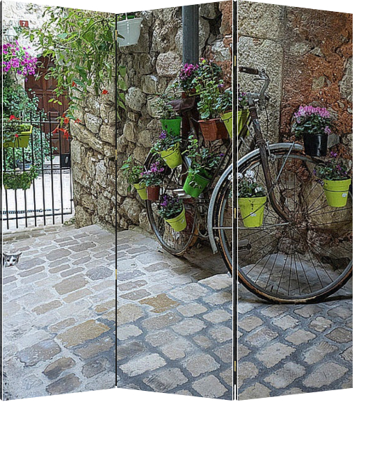 Ширма "Дворик с цветочным велосипедом и испуганным котом"