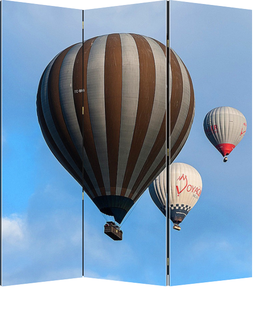 Описание ширмы Турция. Капподокия. Одна из древнейших сред обитания человека. Для охвата всей красоты древнего, созданного вулканами и потопами, пейзажа совершаются полеты на воздушных шарах.