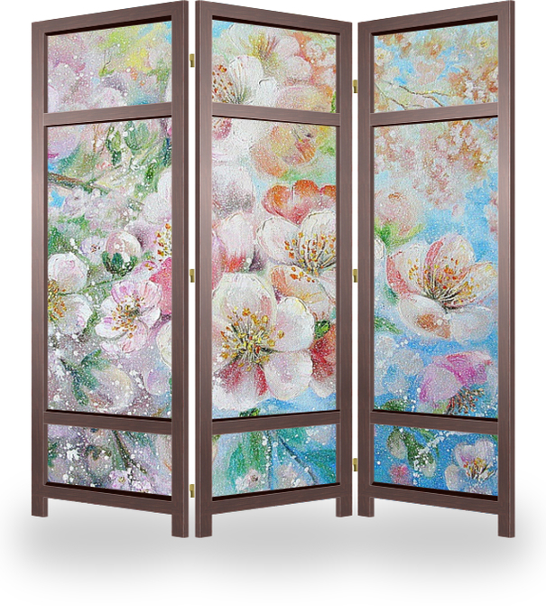 Описание ширмы Оригинал - картина на холсте, написанная маслом. Цветущие яблони, дивный аромат, весенняя романтика.Время цветения - это всегда юность, любовь или воспоминания об этом. Картина о весне - отличный подарок близкому человеку.