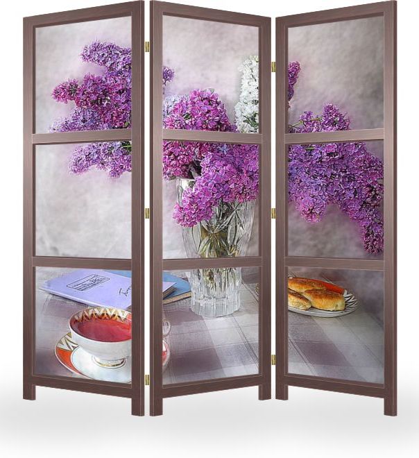 Описание ширмы Натюрморт на с букетом сирени , пирожками и горячим чаем . Фотография при естественном освещении , кадрирование в незначительная обработка в фотошопе,