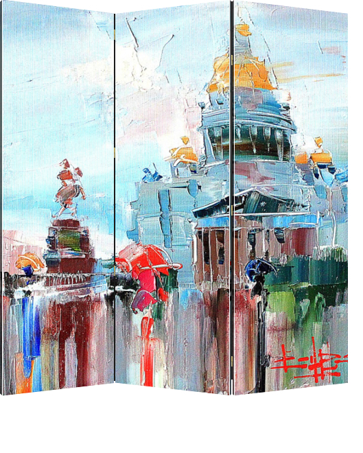 Описание ширмы Картина из серии "В дождь и после" написана художником Константином Сухоплюевым. Сам художник Родился и вырос в Санкт-Петербурге. С ранних лет ему знаком запах масляных красок, он постоянно находился в художественных кругах, поскольку отец Константин