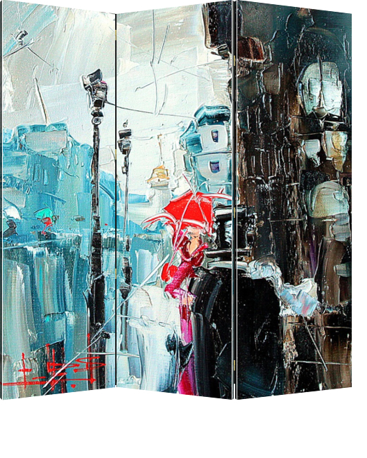 Описание ширмы Картина из серии "В дождь и после" написана художником Константином Сухоплюевым. Сам художник Родился и вырос в Санкт-Петербурге. С ранних лет ему знаком запах масляных красок, он постоянно находился в художественных кругах, поскольку отец Константин