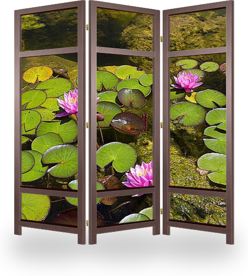 Описание ширмы На фотографии цветущие розовые кувшинки в пруду. Снято в дневных условиях, во время солнечного летнего дня. Кувшинки всегда привлекают внимание людей за их красоту.
