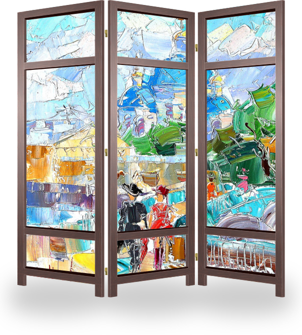 Описание ширмы Картина из серии "В дождь и после" написана художником Константином Сухоплюевым. Сам художник Родился и вырос в Санкт-Петербурге. С ранних лет ему знаком запах масляных красок, он постоянно находился в художественных кругах, поскольку отец Константин