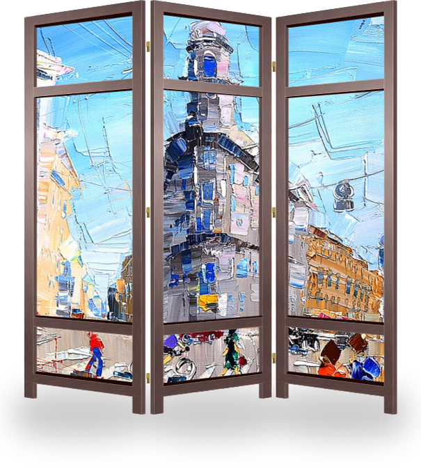 Описание ширмы Картина из серии "В дождь и после" написана художником Константином Сухоплюевым. Сам художник Родился и вырос в Санкт-Петербурге. С ранних лет ему знаком запах масляных красок, он постоянно находился в художественных кругах, поскольку отец Константин