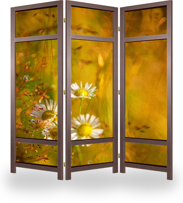 Описание ширмы Фотографировал как-то утром бабочек, все было в росе, только вот бабочок не было очень много, чего не скажешь о этих ромашек, вот и решил сфотографировать их.