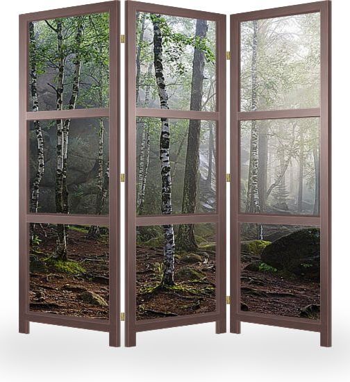 Описание ширмы На фото заповедник Красноярские Столбы. Прямо перед нами - основание скалы Первый Столб. Беспорядочно рабросанные тут и там камни, покрытые мхом, редкие небольшие деревца, земля, вся испещренная обнажившимися корнями, и над всем этим нависает огромна