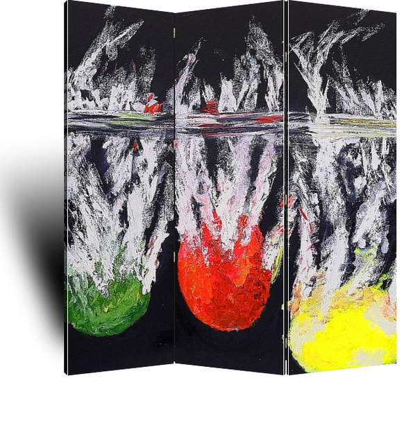 Описание ширмы Игра света и контрастность красок динамично передают мгновение опустившихся в воду фруктов материалы: масляные краски, грунтованный холст на подрамнике 50х60 см