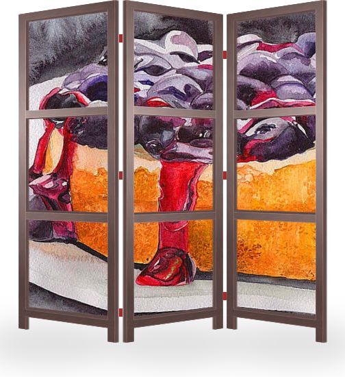 Описание ширмы Душистый бисквит с черникой передаёт настроение осеннего вечера, улетающих с болот стай диких уток, а в доме - горит свет, тепло и уютно, ведутся душевные разговоры и разливается горячий чай.