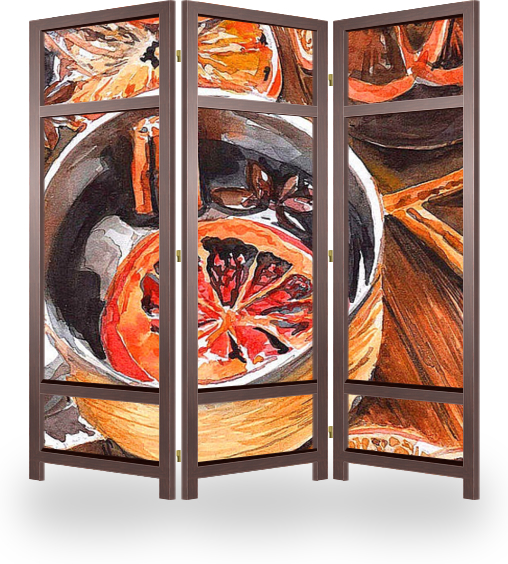 Описание ширмы Горячий напиток - глинтвейн, с цитрусами и специями, хорош после длительной прогулки по лесу в холодную погоду. Он согревает душу и тело, даёт вдохновение.
