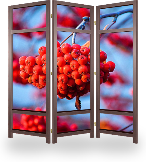 Описание ширмы поздней осенью, когда листва уже опала и сквозь деревья видно небо почти единственным цветным пятном остаются ягоды рябины. Зябнут берёзы, стынут осины. Только горят на морозе рябины. И отовсюду – смотри-ка, смотри! - Греться к рябине летят с