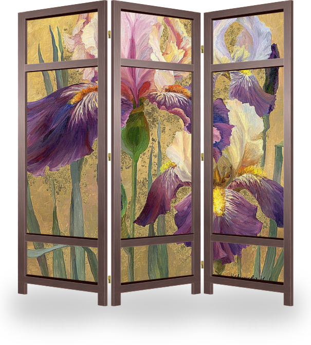 Описание ширмы В этой картине я использовала новый для себя прием - золотой фон. Применяла сусальное золото. Мне хотелось достигнуть эффекта солнечного света, чтобы цветы были не на каком-то плотном фоне, а были окружены только воздухом и светом.