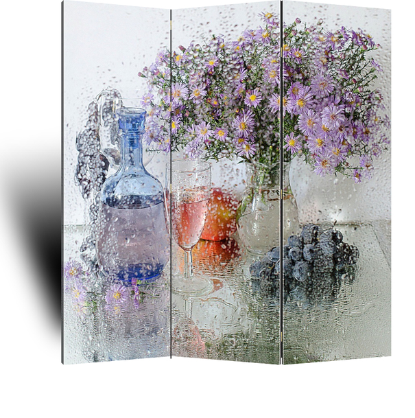 Описание ширмы За окном дождь,а в Вашем доме тепло и уютно.Букет мелкоцветковых хризантем и немного фруктов украсят ваш дом и наполнят его прекрасным настроением.Такой постер украсит ваш дом.