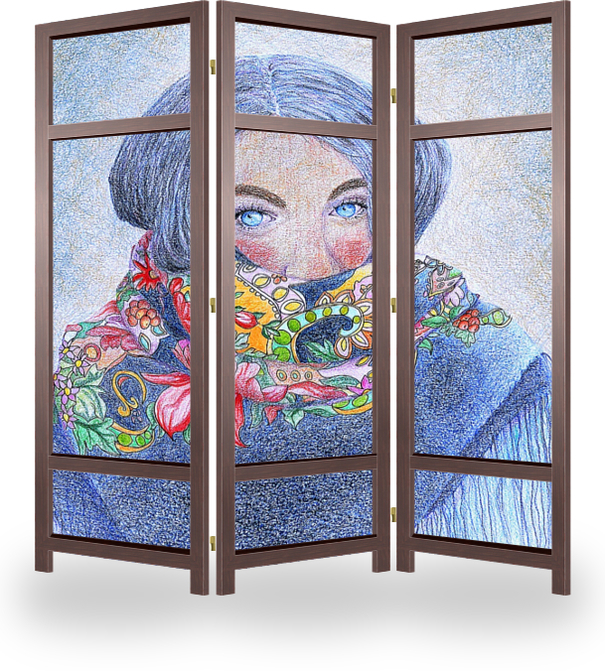 Описание ширмы Нарисована картина акварельными цветными карандашами. Вдохновила на создание портрета фотография подруги в цветастом платке с традиционным русским узором