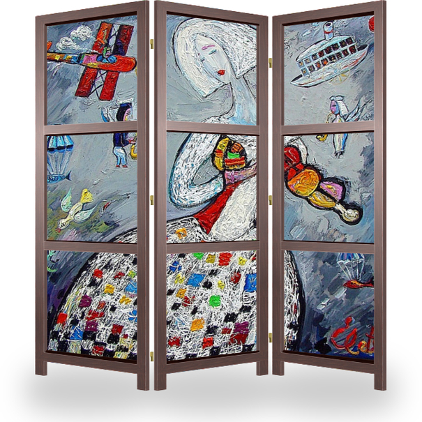 Описание ширмы Девушка играющая на скрипке, в окружении воздухоплавателей, холст, масло, 100Х100, 2014 год.
