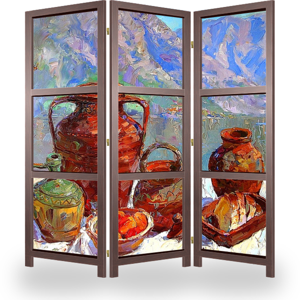 Описание ширмы Натюрморт написан в Черногории во время летнего пленэра. Фоном натюрморта служат горы, обрамляющие Боко-Которский залив. Это и делает натюрморт более "живым".
