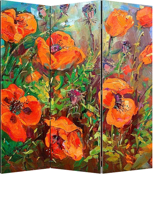 Описание ширмы Маки всегда эффектны и притягательны. Лучи солнца играют в нежных лепестках и они порхают, словно лёгкие бабочки. Эти цветы обладают удивительной способностью создавать особый энергетический настрой, дают мощный жизненный импульс.