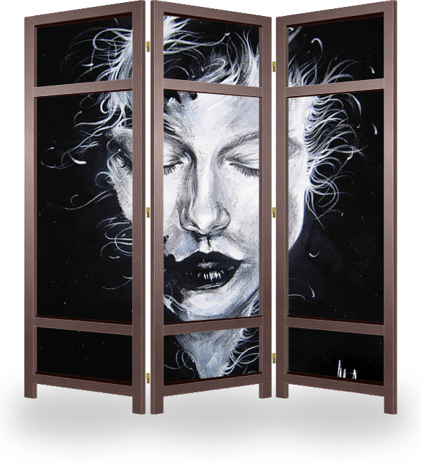 Описание ширмы "Молчание". Техника: холст/акрил. Художник: Минайдарова Айдана. Картина написана в технике сюрреализм. Изображенная на картине девушка, символизирует женскую сущность,ее умение и способность растворяться в собственных мыслях.