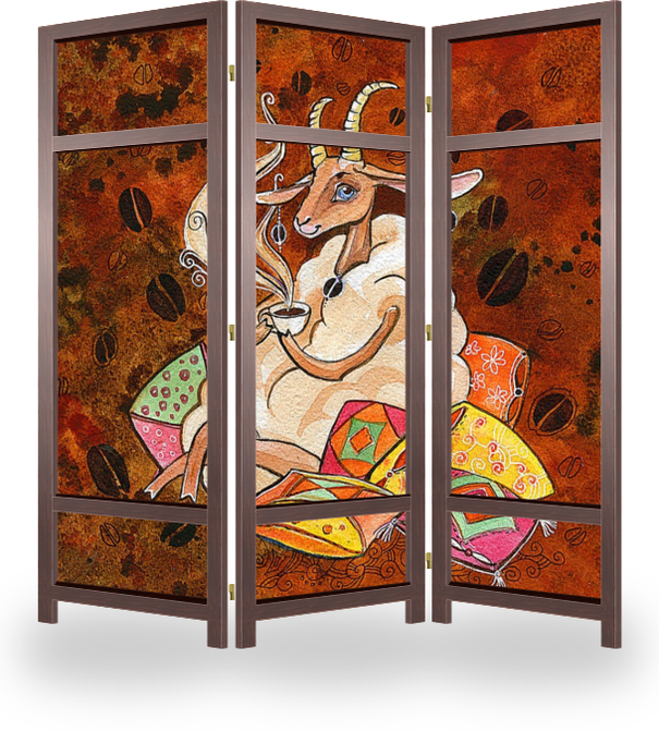 Описание ширмы овечка, на мягких подушках пьет ароматный кофе. уютная и теплая картинка, нарисованная акварелью не просто украсит, но и внесет элемент легкого очарования и ми-ми-ми в атмосферу