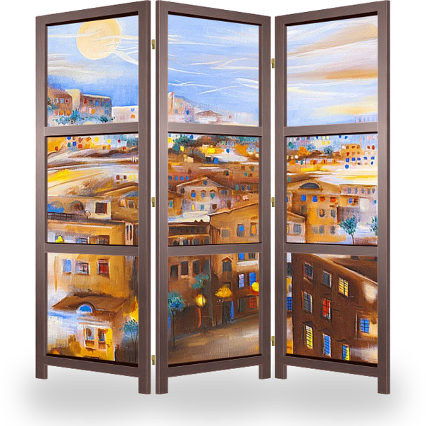 Описание ширмы Городские пейзажи Италии освещены более мягким и близким светом, причем источником его может быть как обыкновенный фонарь, так и блуждающее радужное пятно, прикрытое лёгким утренним туманом. В этой «лунной» картине с пейзажами Генуи, . присутстви
