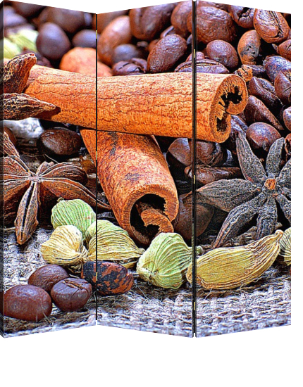Описание ширмы Кофе в зернах, лежащий на мешковине вместе со специями ( пряностями) бадьяна, кардамона и двумя палочками корицы. Студийная съемка с тремя источниками освещения, с применением белого отражателя, фотоаппарат на штативе, объектив nikkor 85mm f 1.8, с п