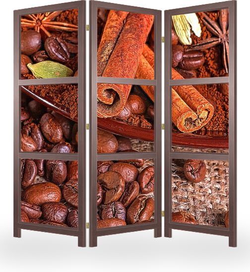 Описание ширмы Кофе в зернах и молотый лежащий в тарелке вместе с двумя палочками корицы с зернами кардамона и звездочками бадьяна. В нижней части снимка зерновой кофе рассыпанный на мешковине. Студийная съемка с тремя источниками света и применением белого отражат