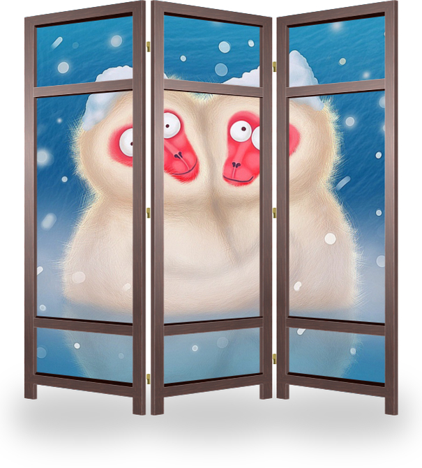 Описание ширмы Иллюстрация японских макак забавном стиле. Зимой они проводят морозы в горячих источниках, греются и трутся друг о друга. Выполнено с помощью растровой графики.