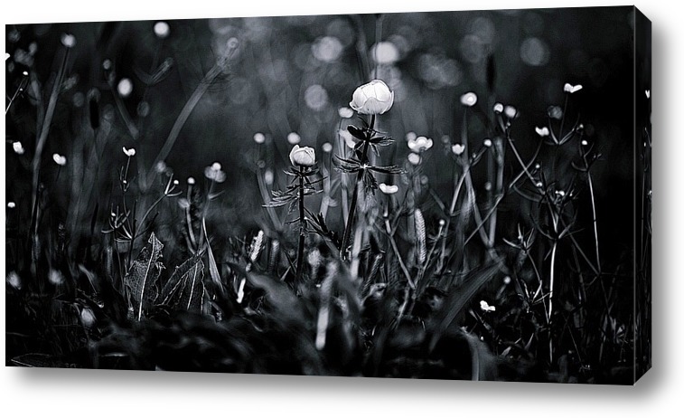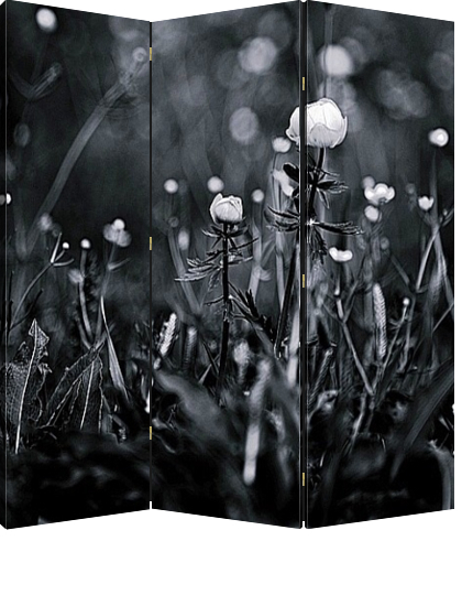 Описание ширмы Полевые цветы Купальницы в монохроме. Сфотогафированы в средней полосе России в поле, где среди высокой травы, цвели кустиками жёлтые цветы Купальницы. Использовалась авторская техника фотосъёмки и обработки.