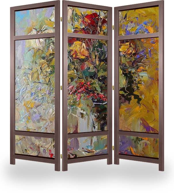 Описание ширмы На дворе стояла непогода, дождь лил, как из ведра. Самое время для художника начать писать натюрморт, букет цветов, грустящих вместе с непогодой. Нужно лишь добавить ярких , нежных, оптимистичных красок на холст- и настроение у всех вокруг улучшится