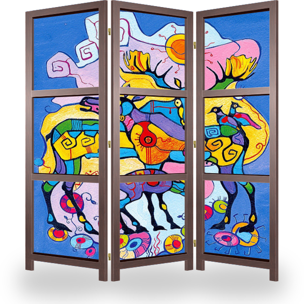 Описание ширмы Графическая стилизованная композиция на тему природы и ее обитателей в этническом стиле. Олицетворяет собой спокойствие, умиротворение, гармонию природы, что также выражается и в цветовой гамме работы, в спокойных сиреневых синих и розоватых тонах ве