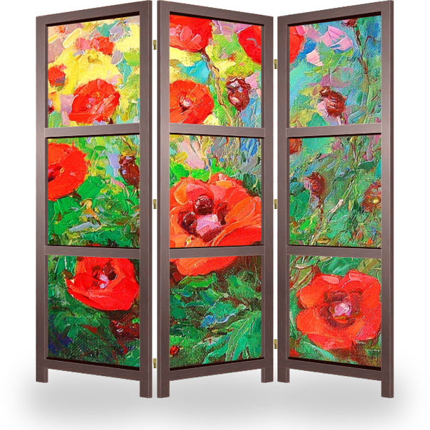 Описание ширмы Я писал маки не раз и пора бы уже остановиться. Но, когда ранним июньским утром доброе солнце снова заиграет в их лепестках, боюсь, я не удержусь и снова возьмусь за кисти. Солнечные цветы!