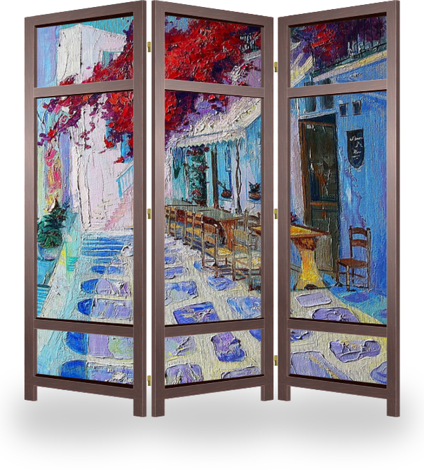Описание ширмы Очень хорошая новая работа автора. Отлично подойдет почти в любой интерьер. Очень сочные цвета, передает положительную энергетику и способствует хорошему настроению. Работа будет ярким и красивым акцентом вашего интерьера. Южный колорит работы будет