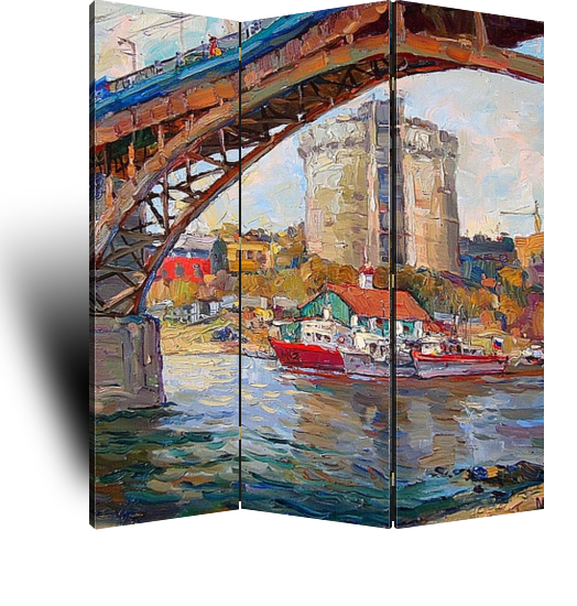 Описание ширмы Работа "На Самарке" была написана во время летнего пленэра. Счастливы города, которые стоят на берегу рек . Мосты соединяющие берега служат украшением города и верными помощниками и обладают своеобразной индустриальной красотой и мощью