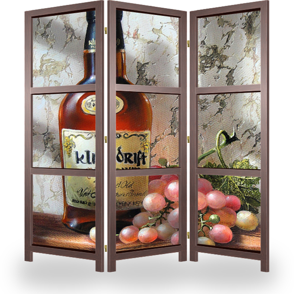 Описание ширмы Картина создана в рамках большой и ещё продолжающейся серии "Вина Мира". Картины этой серии изображают вино и крепкие напитки в окружении винограда. Натюрморт изображен на фоне освещенной солнцем стены, которая рассечена тенью.